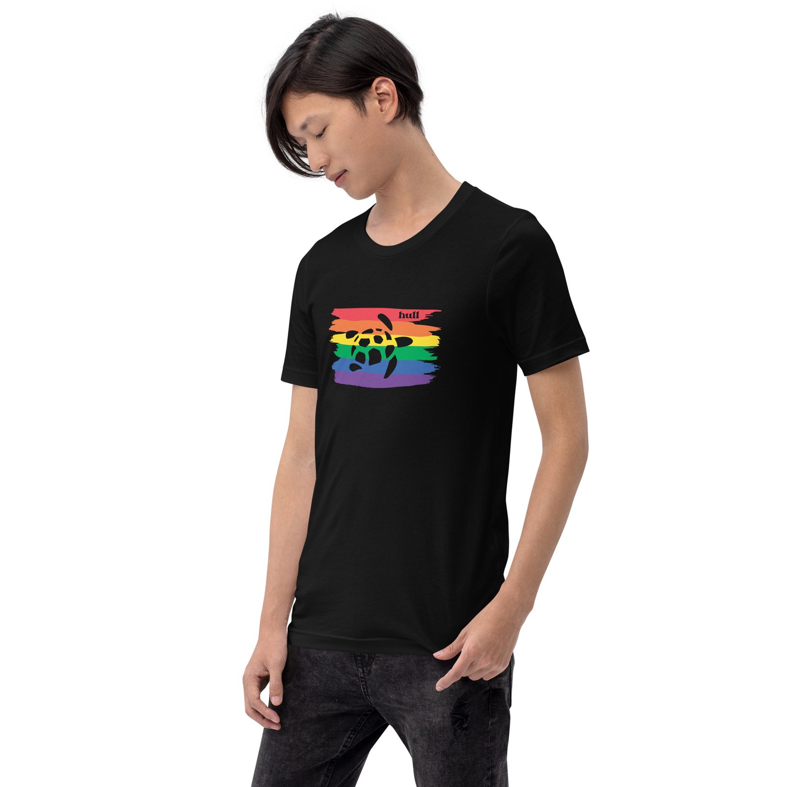 Mas a verdadeira estrela desta peça é a nossa icônica tartaruga Hull, que emerge majestosamente do fundo, simbolizando a união e a resiliência. Esta camiseta é mais do que moda; é uma declaração de apoio à comunidade LGBT e ao respeito pela diversidade.