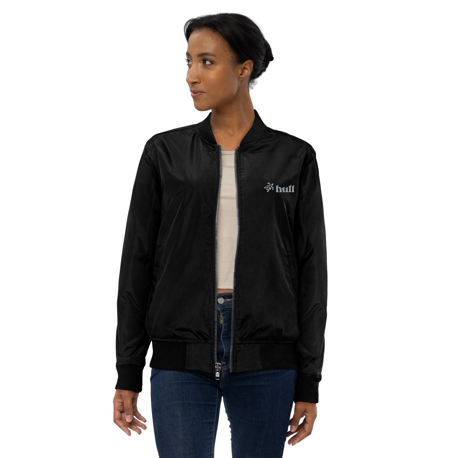 Jaqueta Bomber Tecido Reciclado Preta Bordado